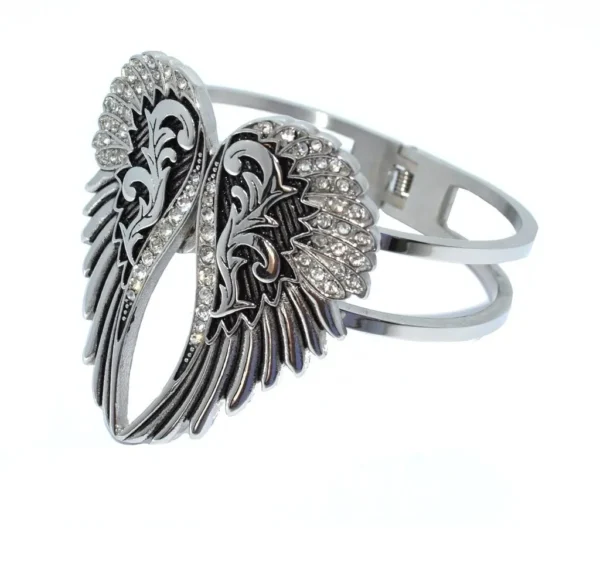 A gorgeous bangle with 2 wings with imitation diamonds creating a heart.  Stainless steel,  fits 8 inch wrist.